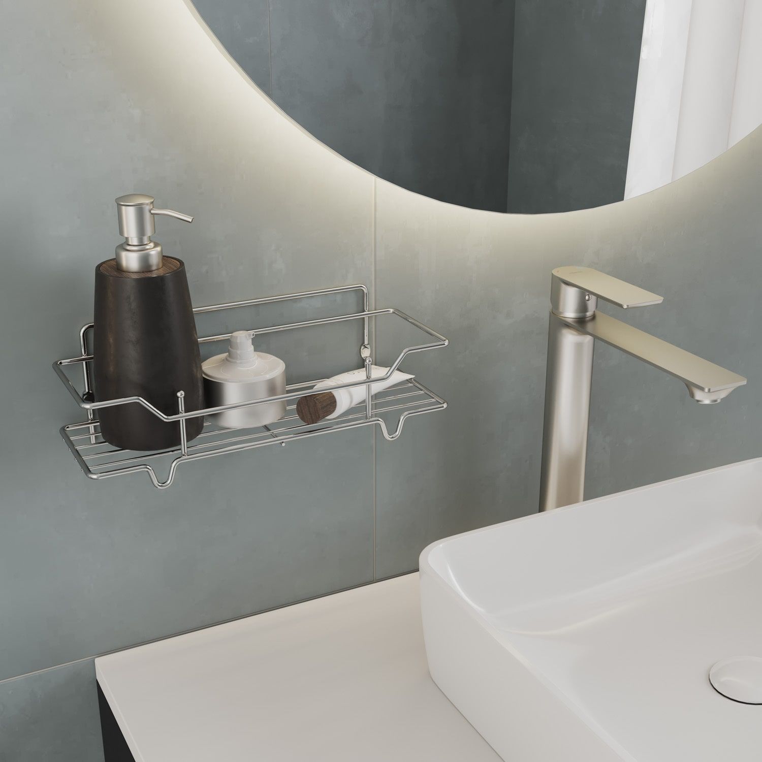 За счет устойчивых упоров снизу полку можно не только крепить к стене, но и устанавливать на плоскую поверхность. Решетчатое дно не даст скапливаться лишней влаге, что предотвратит появление плесени.