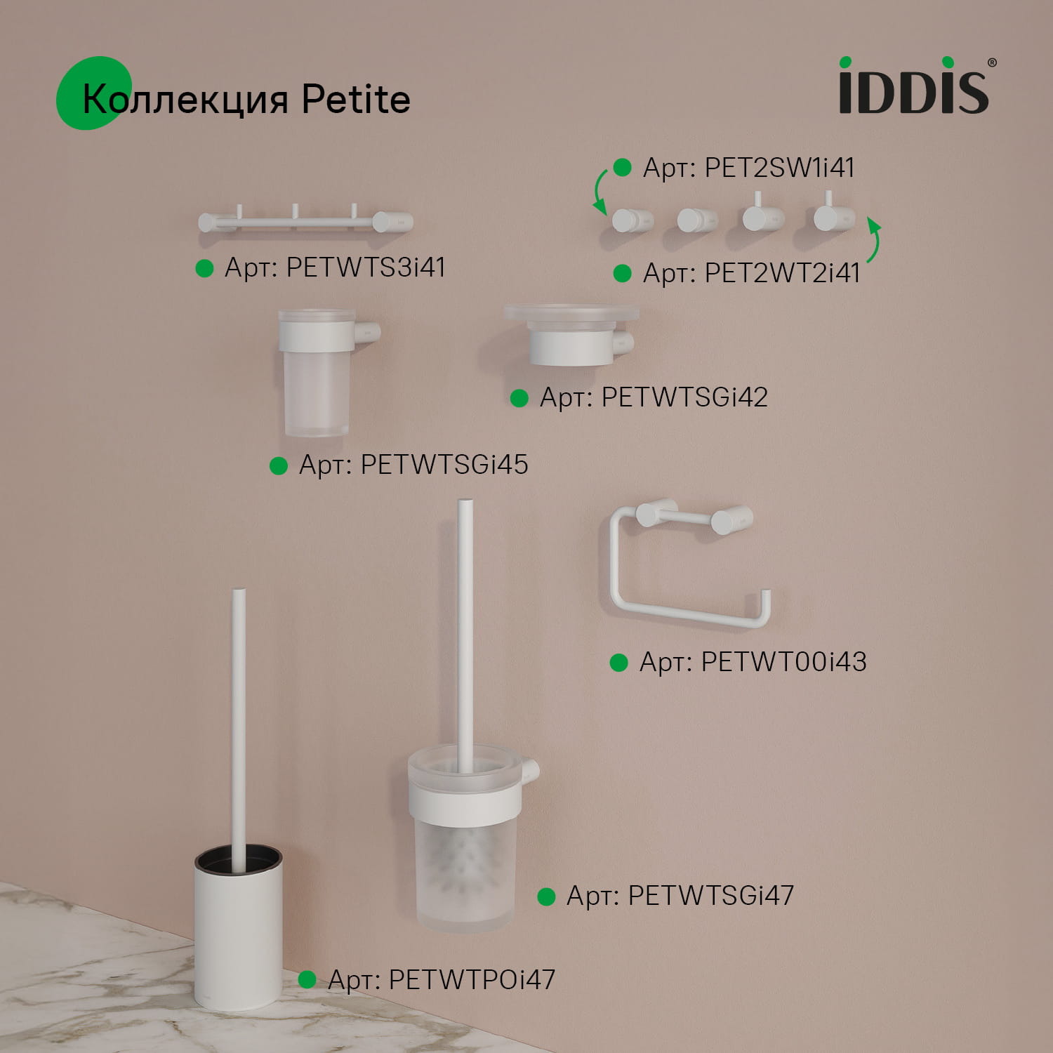 Petite – базовая коллекция функциональных аксессуаров для ванной с минималистичным, спокойным дизайном и округлыми формами, что делает её универсальным украшением любого современного санузла. Аксессуары в универсальном матовом хроме преобразят интерьер, сделают его завершённым и гармоничным. Идеально дополнят смесители IDDIS® из коллекций Aiger по цвету и форме.