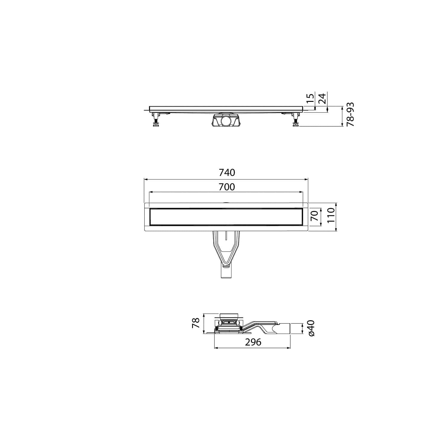 Тип решетки: двухсторонняя (под плитку). Размеры решетки: 700 мм. Вид затвора: комбинированный (мокрый + сухой). Диаметр выпуска в канализацию: 40/50 мм. Пропускная способность: 42 л/мин. Направление выпуска: горизонтальный, вращение 360°. |