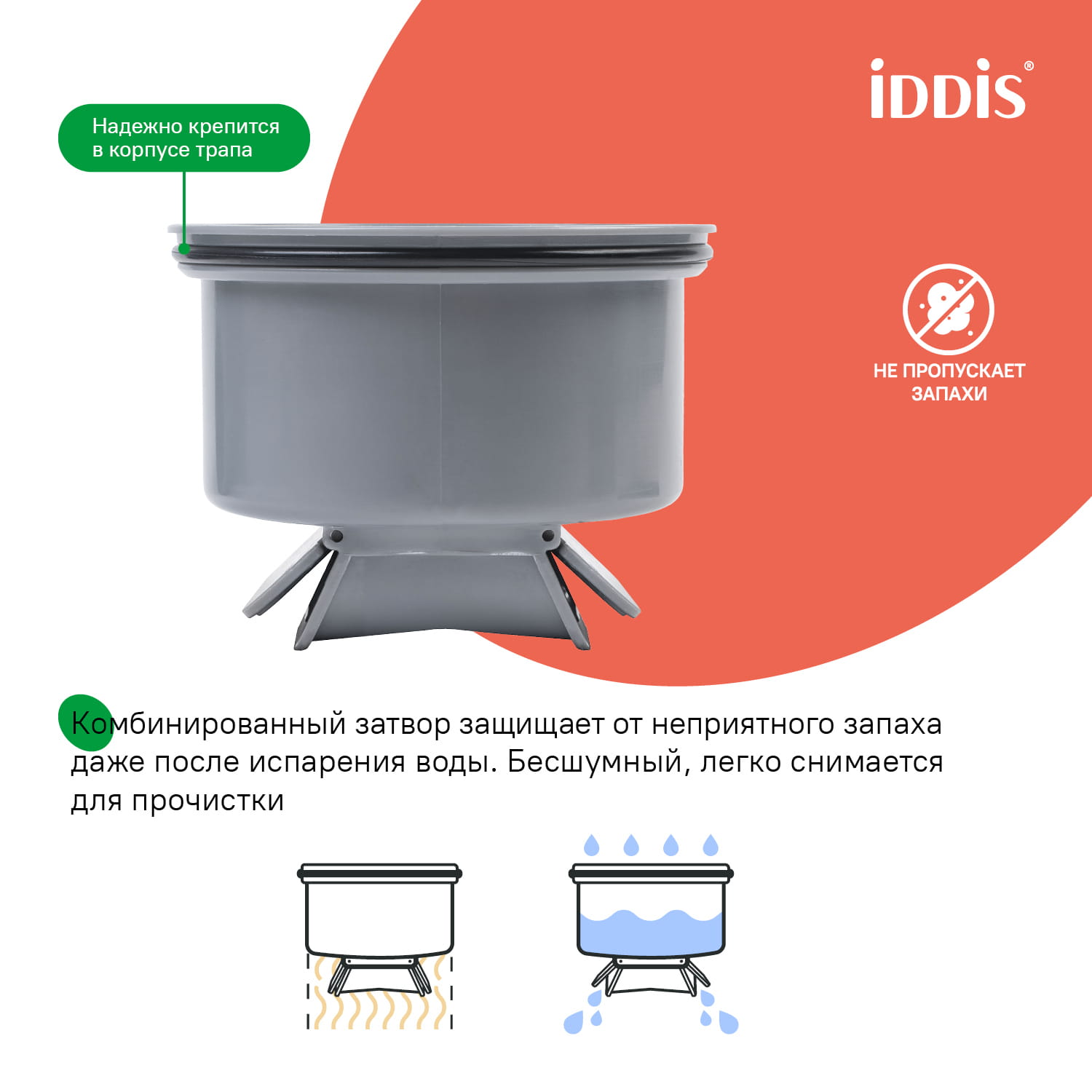 • Оснащен комбинированным затвором, гарантированно защищающим от неприятного запаха даже после испарения воды в сифоне.