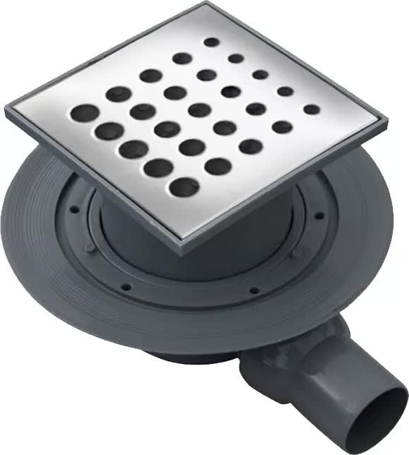 база с S-образным сифоном, гидроизоляционное кольцо, металлический фланец, корпус, гряз улавливающая сеточка, обратный клапан, решетка,, рамка, защитеая крышка при монтаже, крепежи |