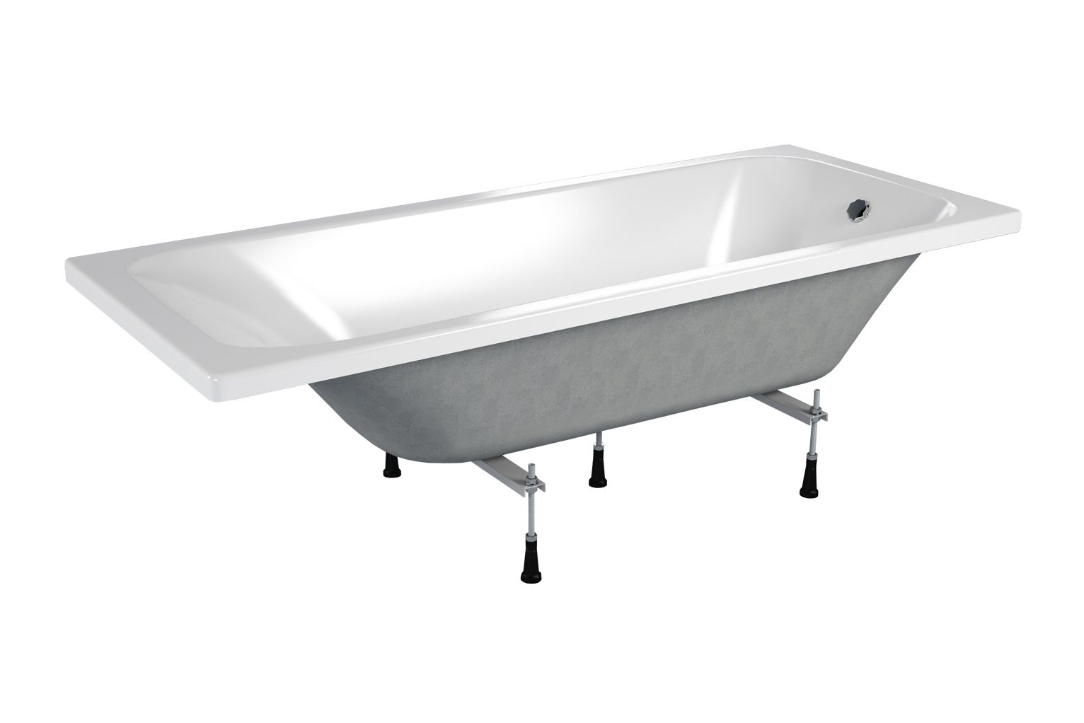 Ванна весит всего 17,45 кг, что упрощает монтаж и транспортировку. Установка осуществляется на регулируемые ножки, которые входят в комплект. Объем чаши — 210 литров, что позволяет с комфортом принимать ванну.